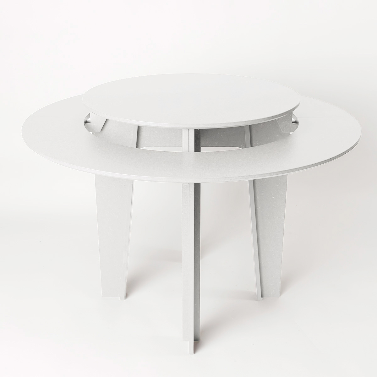 Med Indie får du ”tre bord i ett” som gör att du kan välja utseende efter behov. Enbart toppskivan, med ett hyllplan i framkant eller med två, som tillsammans bildar en cirkel runtom. Hyllplanen blir en given plats för anhöriga att placera handbuketterna på.