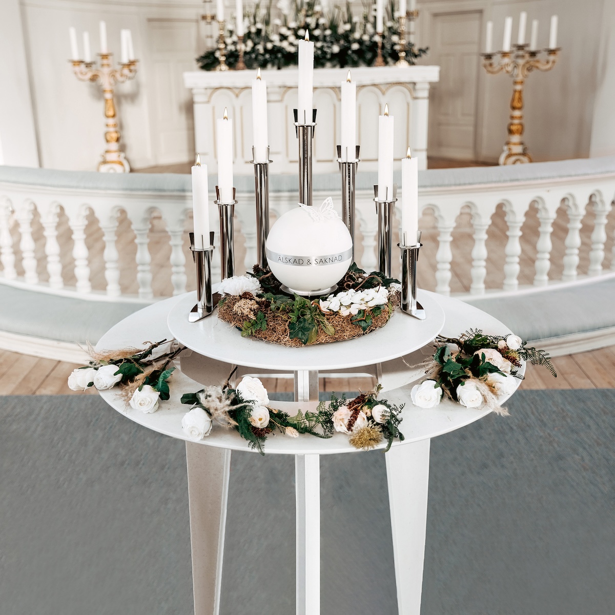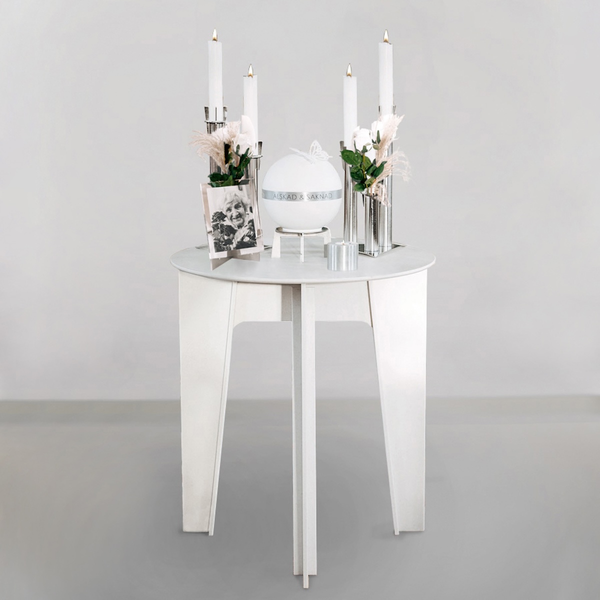 Akt med urna har ökat och fortsätter så att göra. Med Indie får du ”tre bord i ett” som gör att du kan välja utseende efter behov. Enbart toppskivan, med ett hyllplan i framkant eller med två, som tillsammans bildar en cirkel runt om. Hyllplanen blir en given plats för anhöriga att placera handbuketterna på.